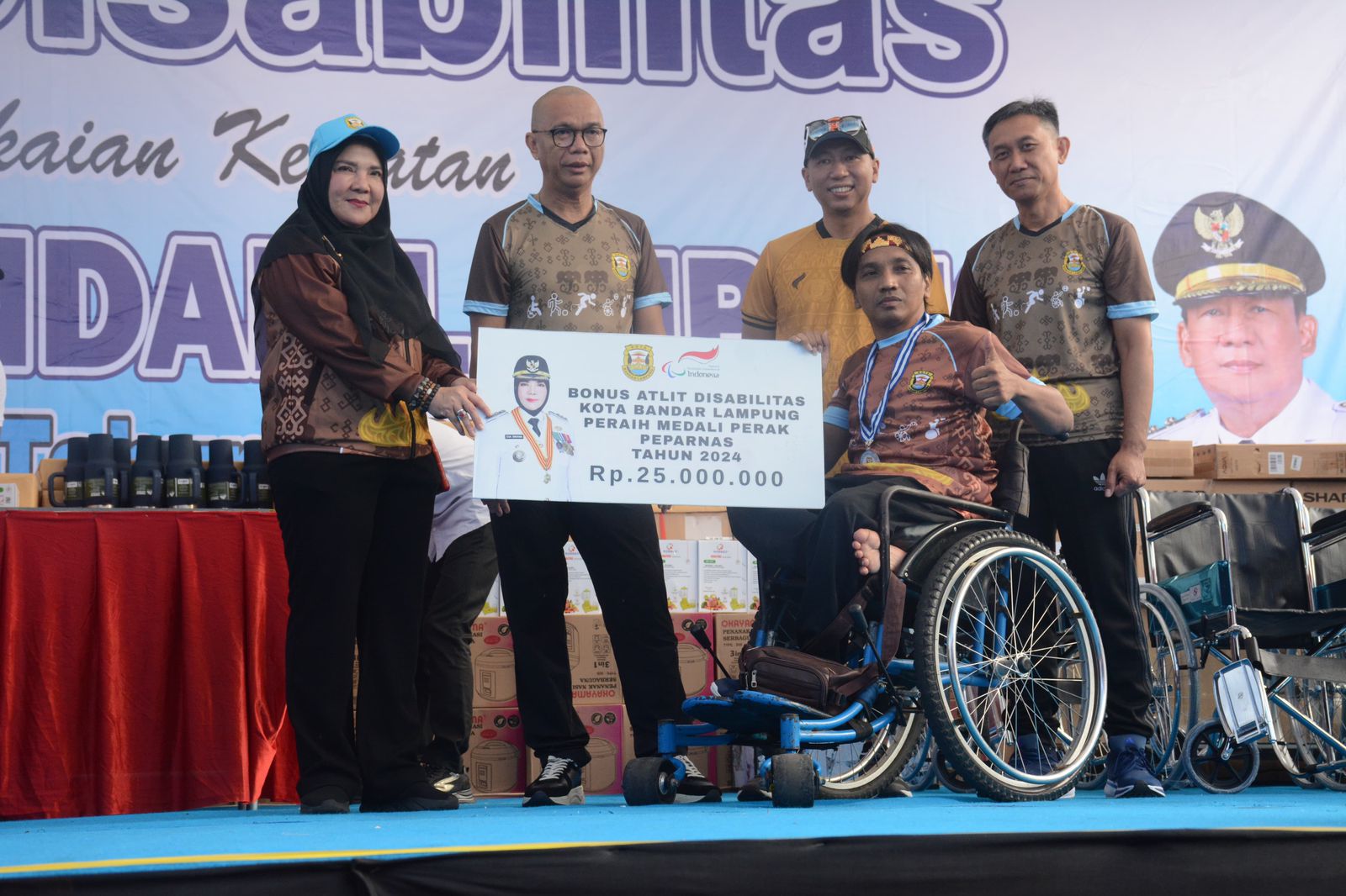 Bandarlampung,Wartasaburai – Oko,Seorang atlit disabilitas Bandar Lampung mendapatkan hadiah umroh dari Walikota Bandar Lampung, Eva Dwiana pada saat even jalan sehat dan senam massal disabilitas di Tugu Adipura Enggal ,Minggu (18/5).Oko sebelumnya berhasil menyabet medali perak pada Pekan Paralimpik Nasional ( Paparnas ) tahun 2024 di Solo.